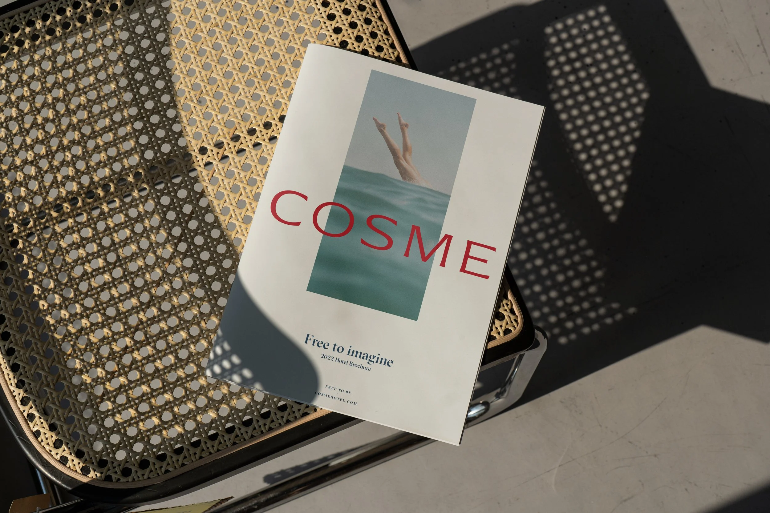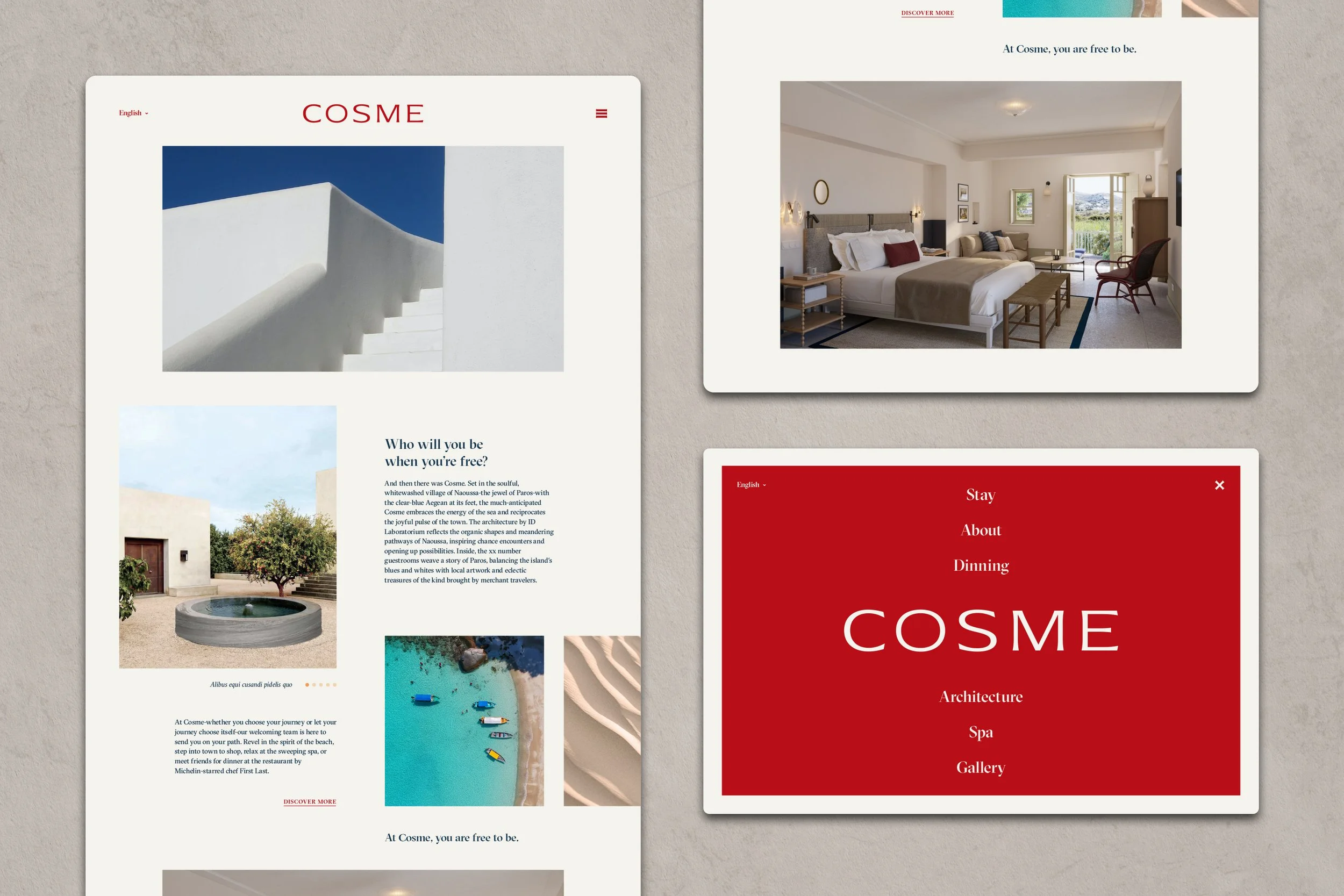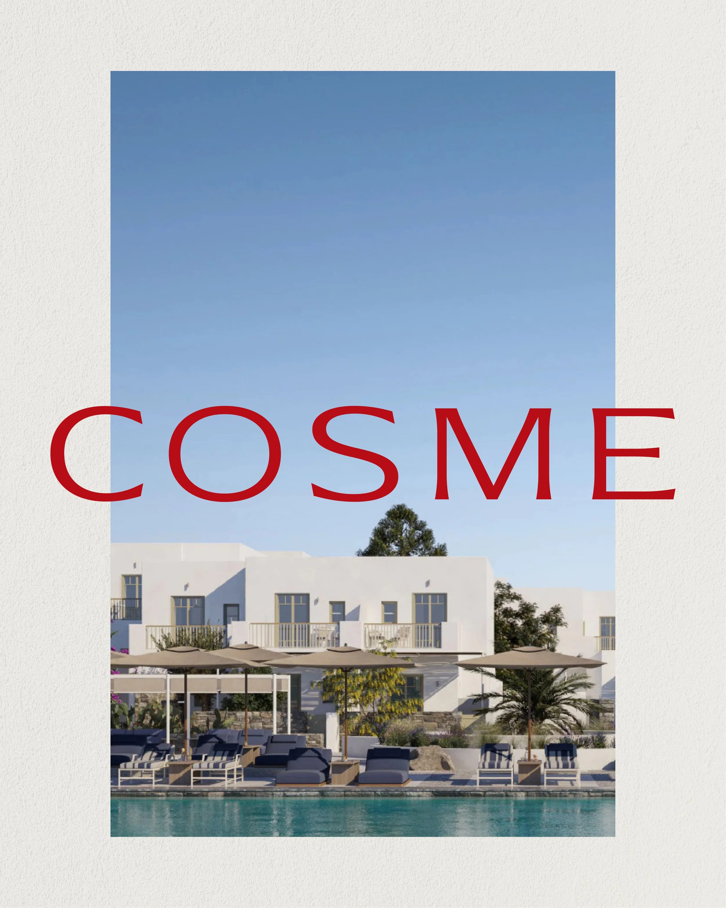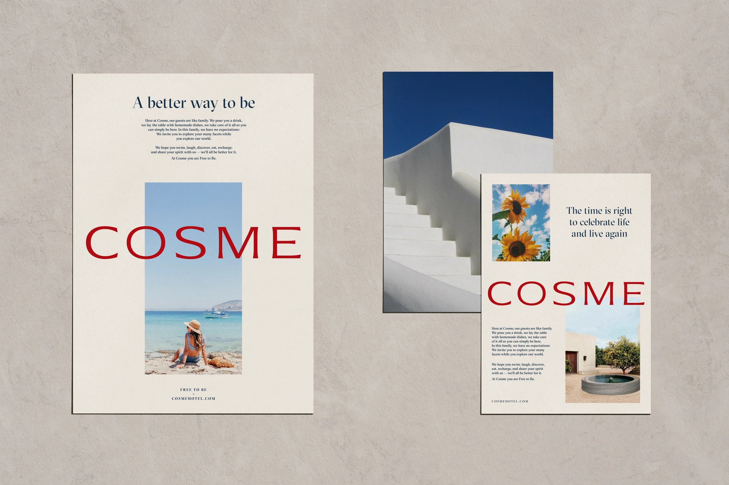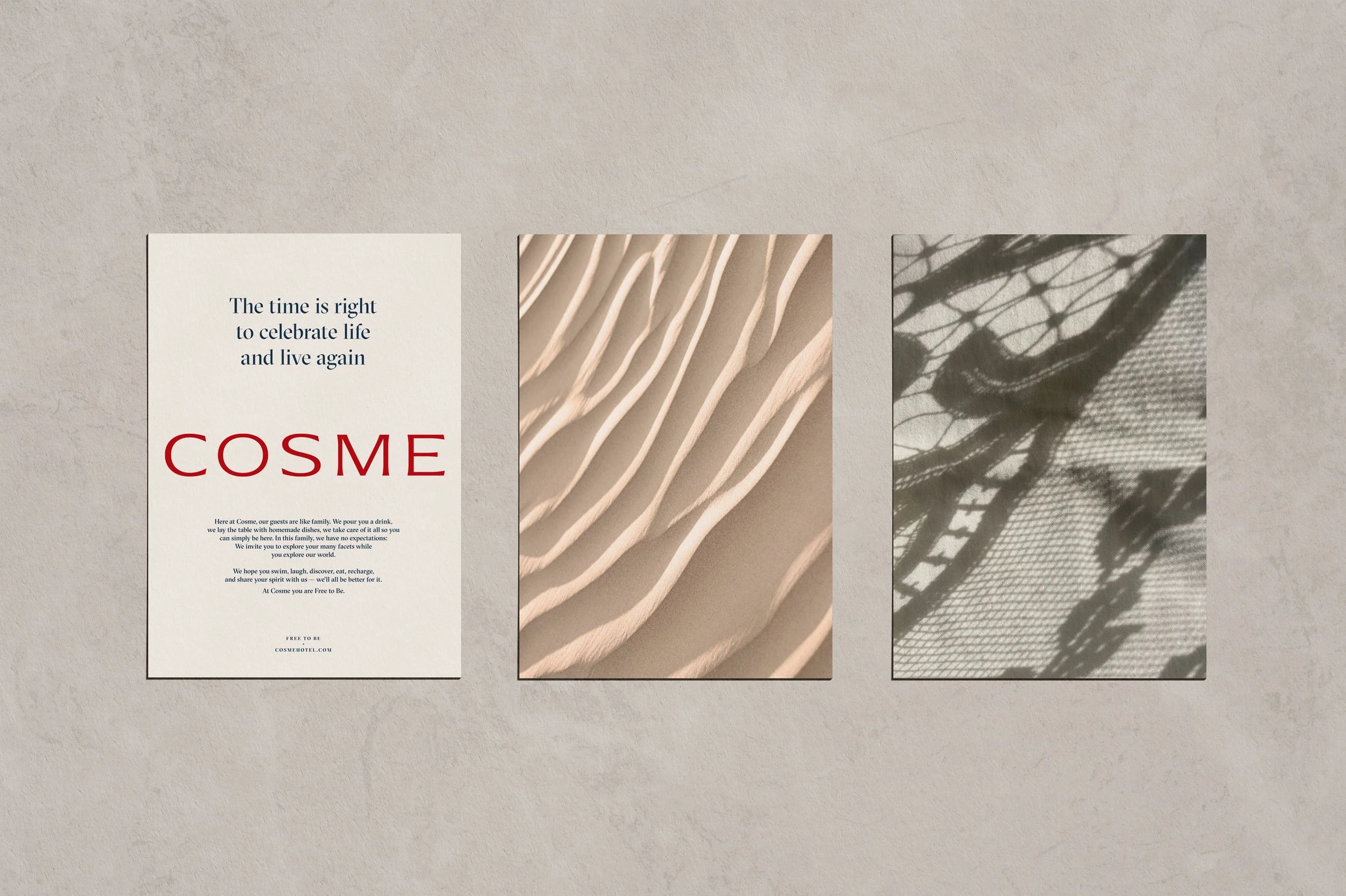 The visual identity follows a simple, yet effective concept that Cosme is the beating heart of Paros. The logo takes pride of place in all printed collateral, with imagery placed behind and all copy above or below. Photography is used to highlight the textures and artworks around the hotel, helping to immersify guests at every touch point.
