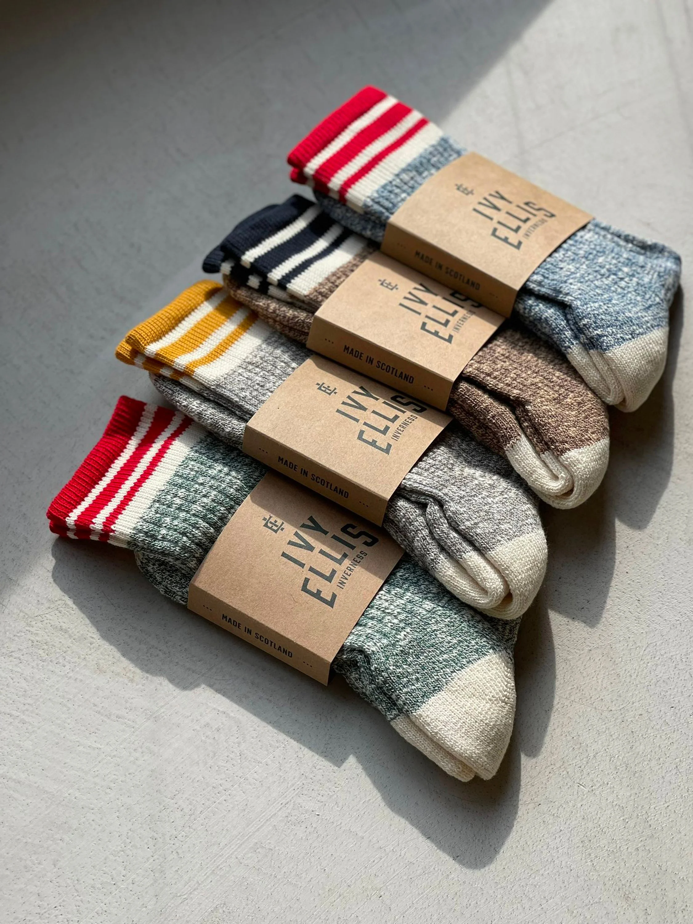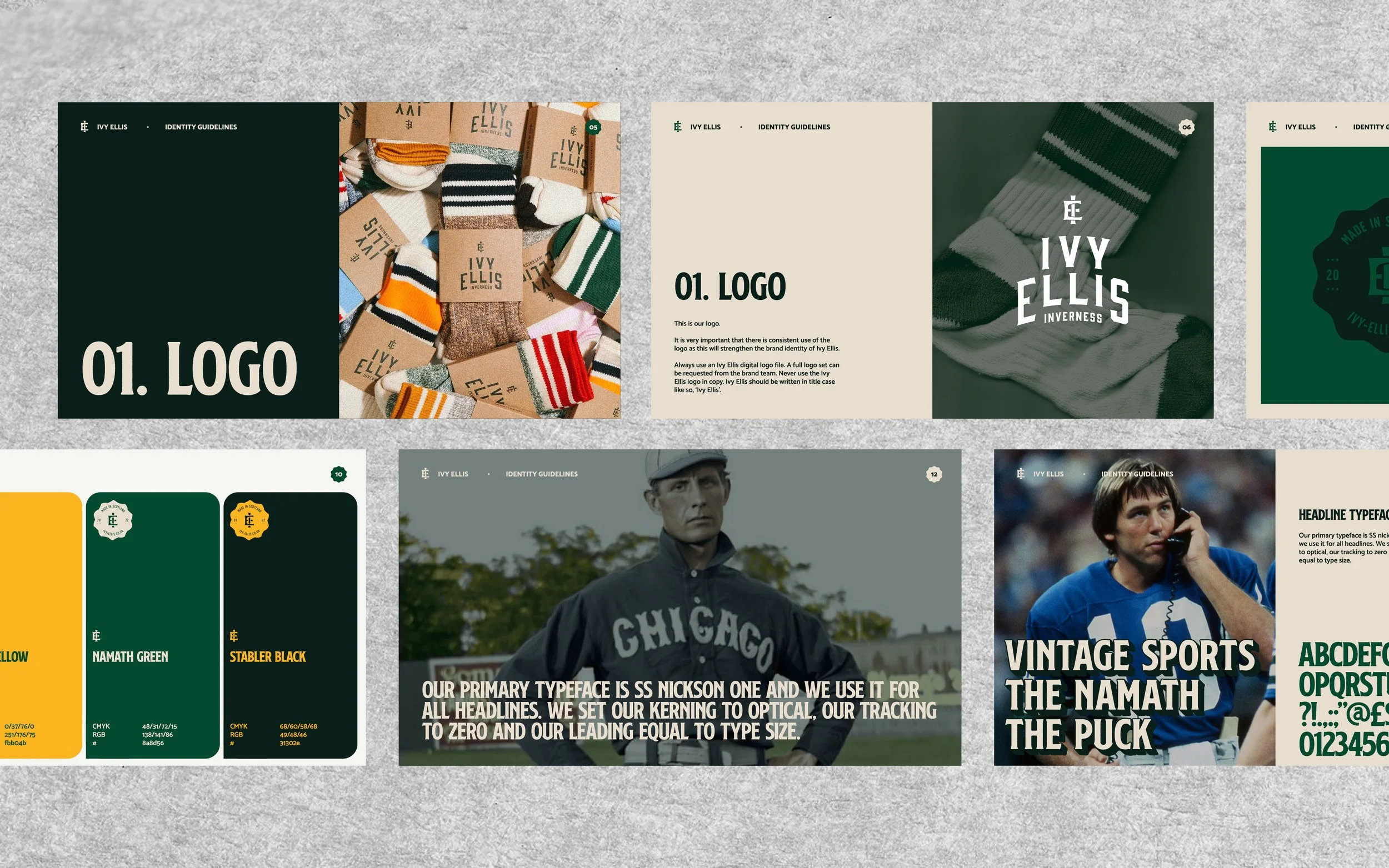Their whole concept is based around the founders love of the Ivy League & vintage sportswear, with each sock taking its name and colours from past sportsmen and women. We used the design cues from vintage sports lettering and team patches to create an authentic looking logotype and monogram, with classic collegiate colours to tie it all together.